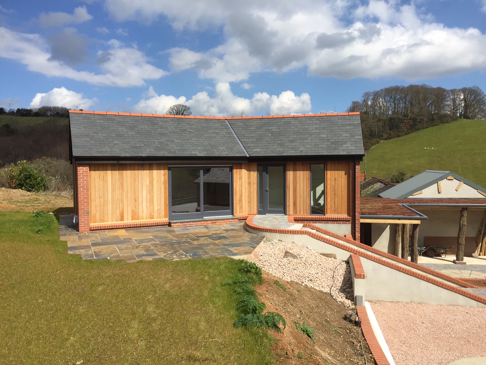 A delighted client has provided some updated images of their project we completed near Exeter . A SIPS build single storey living area over a block build lower front section. The SIPS panels provide the perfect material to create a vaulted ceiling, coupled with superb insulation .Visible detailing and gable end Alu clad double glazed windows from Rationel creates a light and airy space .